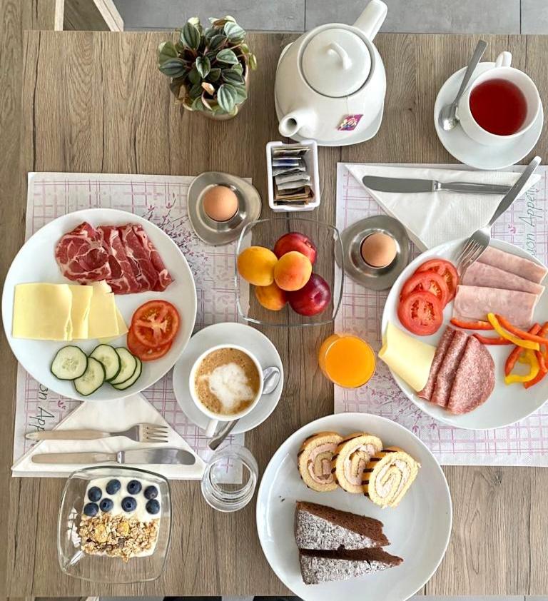 Guests can enjoy a buffet breakfast which includes sweet and savoury food such as different types of bread, cold cuts, boiled eggs, and seasonal fresh fruit.